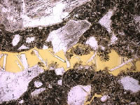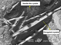 放大的圖片清楚地顯示 裂縫中的粗糙長(zhǎng)晶體 和細(xì)小針狀晶體 |